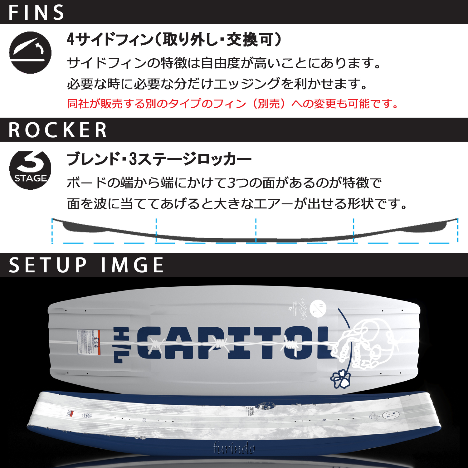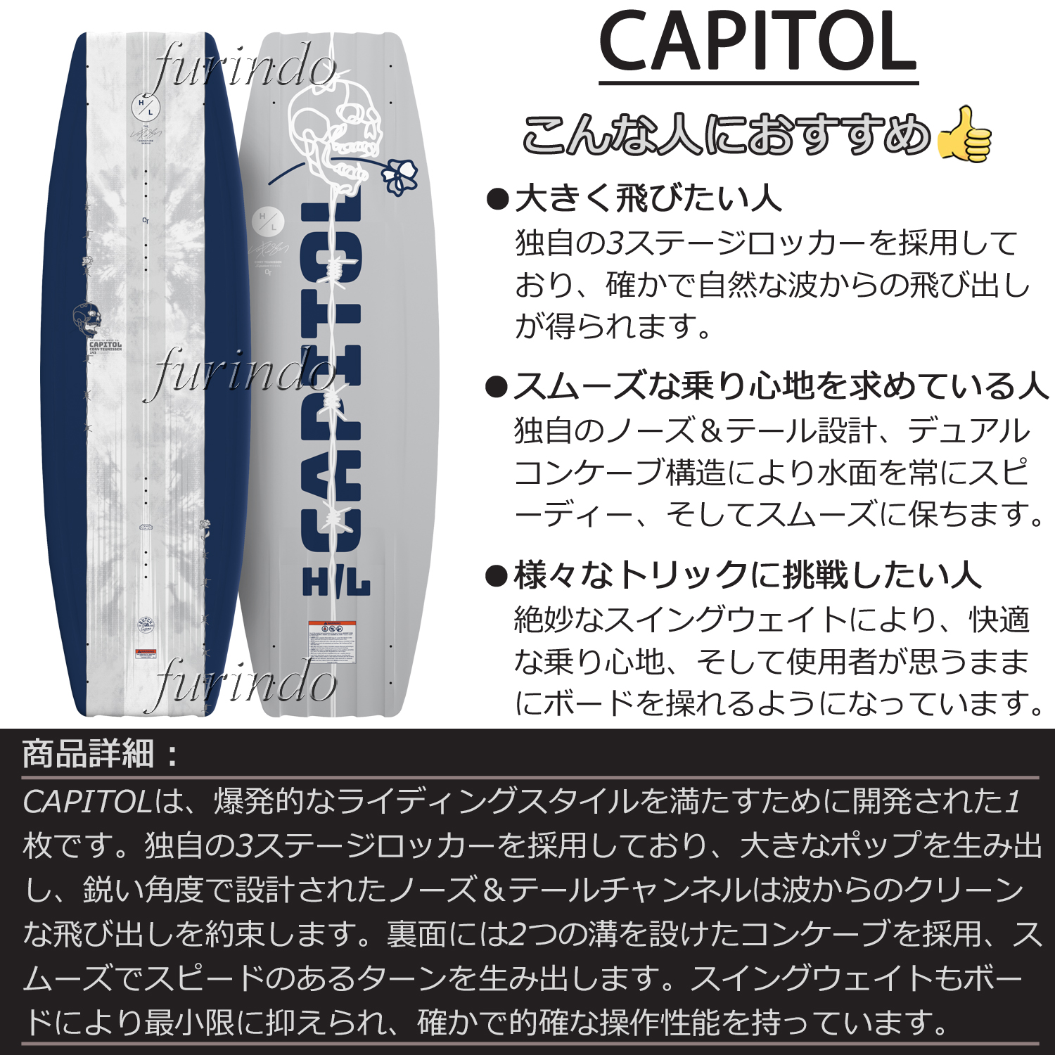 HYPERLITE Capitol(キャピトル)は、Cory Teunissen(コリーテューニッセン)とScott Bouchard(スコットブチャード)が共同開発したハイパフォーマンスウェイクボードです。