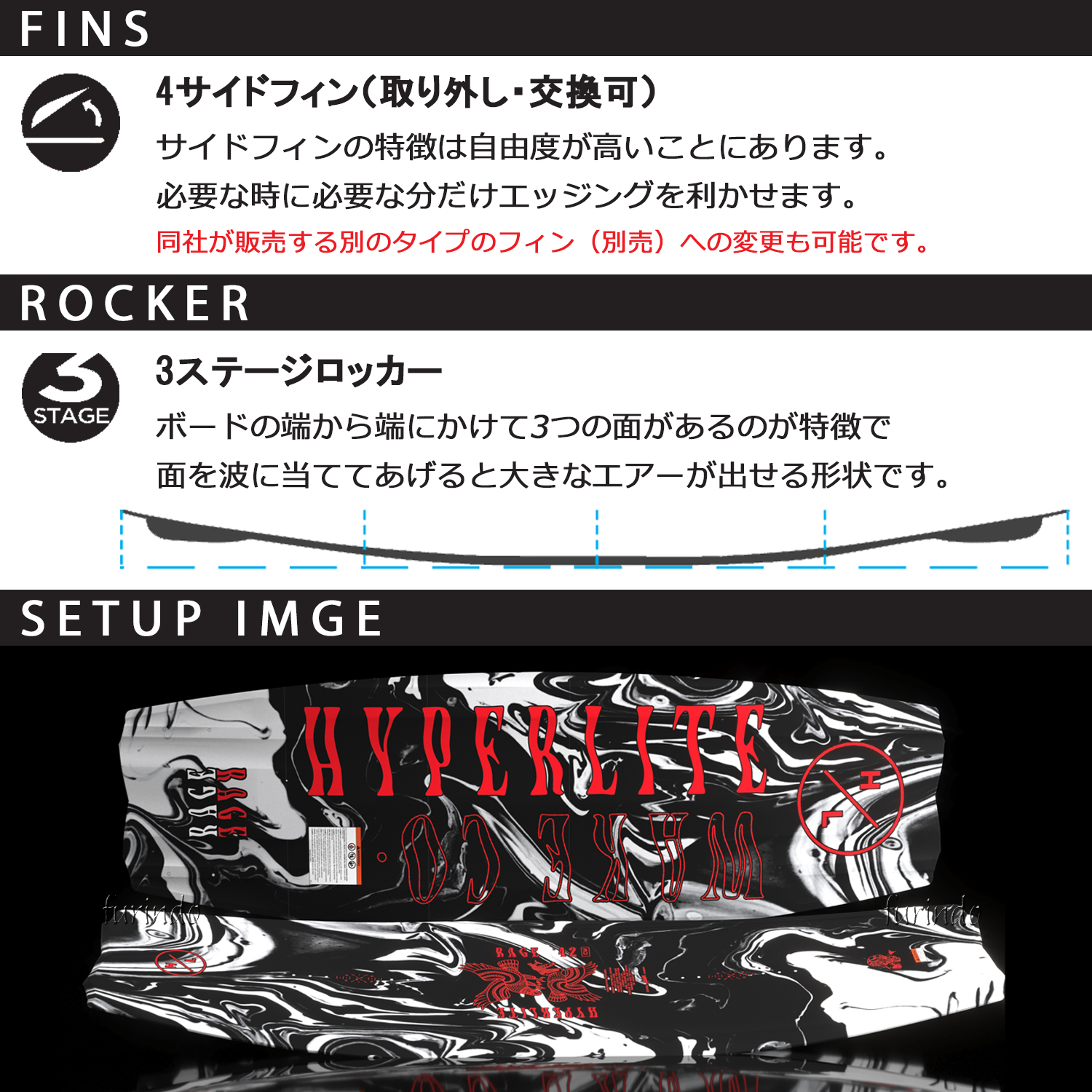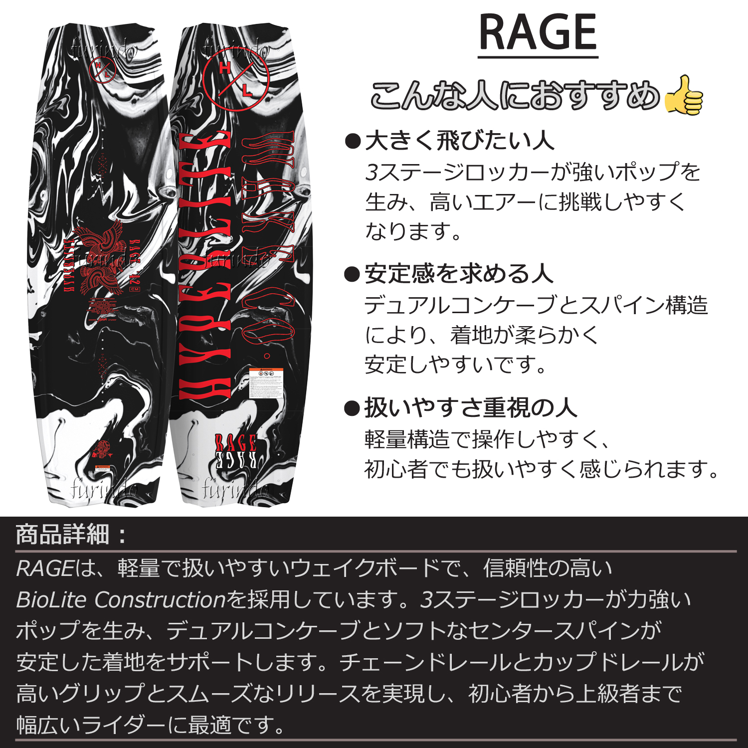 HYPERLITE Rage(レイジ)は、軽量で扱いやすく、幅広いライダーに対応するオールラウンドウェイクボードです。